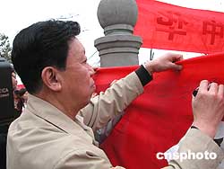 2005年是中國第一個(gè)資產(chǎn)階級政黨中國同盟會(huì)成立100周年。在同盟會(huì)中與孫中山先生并肩作戰(zhàn)的黃興先生,是中國近代史上著名的資產(chǎn)階級革命家。4月5日,黃興的孫子黃偉民來到位于長沙岳麓山上的黃興墓碑前簽名紀(jì)念。作者:肖前輝