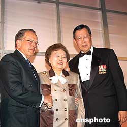 四月七日,正在華盛頓舉行的美國(guó)知名華裔團(tuán)體百人會(huì)年會(huì),為著名的美籍華人社會(huì)活動(dòng)家陳香梅頒獎(jiǎng),表彰她為促進(jìn)美中關(guān)系所做出的貢獻(xiàn)。這是美國(guó)退役將軍傅履仁(右)和美國(guó)會(huì)議員史蒂文斯(左)祝賀陳香梅獲獎(jiǎng)。作者:譚宏偉