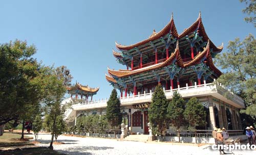 在鄭和故里云南省晉寧縣的鄭和公園里建有一座“三寶樓”,其形似一首巨型鄭和寶船,一層船頭翹首向前,二、三層琉璃瓦制頂,雕龍畫(huà)鳳,四周漢白玉欄上的浮雕是根據(jù)鄭和下西洋帶回的珍禽異獸及出國(guó)時(shí)帶去的瓷器、絲綢等資料精心設(shè)計(jì)的。樓上匾額上書(shū)寫(xiě)著“海上巨人”四個(gè)金字,記者看到施工人員正在緊張施工。據(jù)當(dāng)?shù)毓賳T介紹,為迎接鄭和下西洋六百周年,晉寧縣政府投資二千三百萬(wàn)元對(duì)鄭和公園進(jìn)行改擴(kuò)建。作者:蔣振江