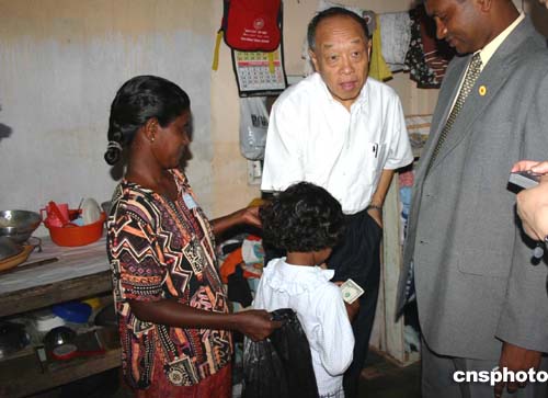 中國外長李肇星四月九日陪同溫家寶總理走訪斯里蘭卡海嘯災區(qū)。李肇星走進災民家中,從口袋里取出現(xiàn)金捐給災民。作者:齊彬