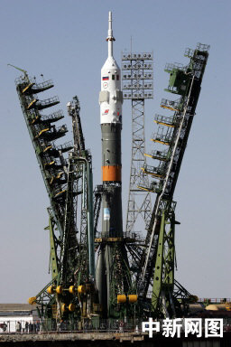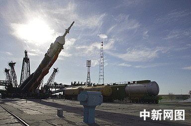 2005年4月13日,在哈薩克斯坦的Baikonur衛(wèi)星發(fā)射基地,Soyuz-TMA-6號飛船助推火箭已被安置于發(fā)射臺(tái)上。Soyuz-TMA-6號飛船將于2005年4月15日搭載一組宇航人員升空去往國際太空站。