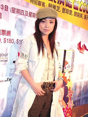 至于唱歌、跳舞及演戲,她覺(jué)得自己哪一方面最難控制?她不諱言是跳舞,因?yàn)樘柚嘤忠櫻輵蚣捌翗,所以她已要求服裝設(shè)計(jì)以安全為主,因?yàn)榧t館四方八面都是觀眾。問(wèn)到安全之余會(huì)否是低胸?她笑道:“低胸也沒(méi)有驚喜啦!總之我的宗旨是視覺(jué)上可觀但又絕對(duì)安全!彼终f(shuō)四位嘉賓中,以她最貪玩,所以如果大家要看她奔放,就不要太少布。