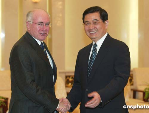 中新社北京四月十八日電(記者齊彬)中國(guó)國(guó)家主席胡錦濤今天下午在人民大會(huì)堂會(huì)見(jiàn)了澳大利亞總理霍華德。
