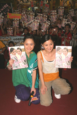 中新網(wǎng)4月19日電 據(jù)香港《大公報(bào)》報(bào)道,Twins繼早前旋風(fēng)式登陸臺(tái)灣及內(nèi)地多個(gè)地方為國語專輯《見習(xí)愛神》宣傳,昨日起程往馬來西亞,抵步后即于市中心一所商場舉行簽名會(huì)。當(dāng)?shù)卣{(diào)動(dòng)數(shù)十軍人維持秩序。簽名會(huì)下午四時(shí)開始,但早上七時(shí)已有Fans排隊(duì),到中午時(shí)份已有數(shù)千人到場拿簽名籌,瞬間三千個(gè)籌已派光;監(jiān)于人實(shí)在太多,龍尾更排至商場外,場內(nèi)圍觀人數(shù)達(dá)過萬人,有關(guān)當(dāng)局更調(diào)動(dòng)數(shù)十位軍人幫忙維持秩序,直至差不多開始簽名會(huì)時(shí),場內(nèi)足足達(dá)萬人圍觀。為滿足一些fans來自星馬及臺(tái)灣等地,逐一為沒有拿到籌的fans簽名,足足簽了七千人之多。