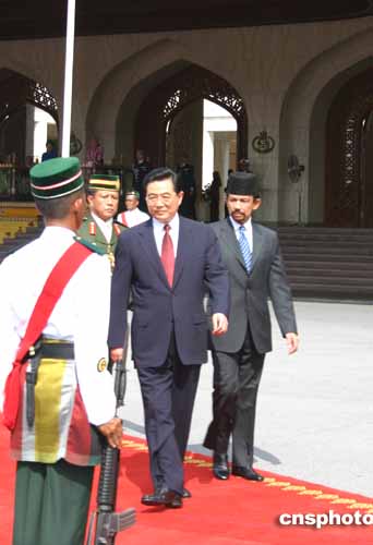 胡錦濤是應(yīng)文萊達(dá)魯薩蘭國蘇丹哈桑納爾的邀請,對文萊進(jìn)行國事訪問的。文萊王儲夫婦到機(jī)場迎接。