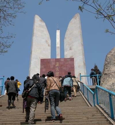 1984年為紀(jì)念孟良崮戰(zhàn)役在山上修建的紀(jì)念碑高30米,由三塊狀如刺刀的灰色花崗石筑成,象征著野戰(zhàn)軍、地方軍和民兵的武裝力量體制。底座為邊長20米、高1.6米的正三棱體,組成一個(gè)槍托,意喻槍桿子里面出政權(quán)。紀(jì)念碑的上下部構(gòu)成一個(gè)有機(jī)的整體,象征著軍民團(tuán)結(jié)必勝,人民戰(zhàn)爭必勝。