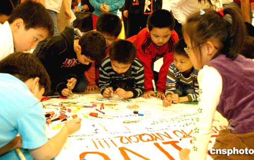 四月二十一日,紐約市申辦奧運會執(zhí)行委員會和基督教青年會(YMCA)聯合主辦“慶祝二00八年北京奧運成功和紐約申辦二0一二年奧運成功”活動,紐約小學生用彩筆簽名表達祝愿。作者:龔文謨