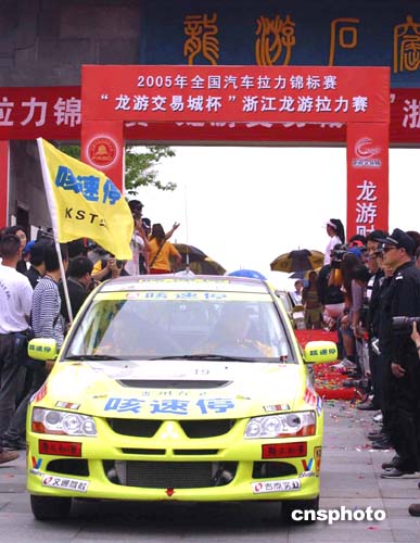 中新社衢州四月二十三日電(記者 王歡)連綿春雨中,二00五年全國(guó)汽車(chē)?yán)﹀\標(biāo)賽“龍游交易城杯”龍游站比賽今天完成了第一階段九個(gè)賽段的艱苦拉力,參賽的六十六輛賽車(chē)中有近一半因意外退出。本土作戰(zhàn)的紅河拉力車(chē)隊(duì)徐浪表現(xiàn)搶眼,拿下九個(gè)賽段的六個(gè)第一,在N組(大排量組)參賽的中國(guó)車(chē)手中名列前茅。