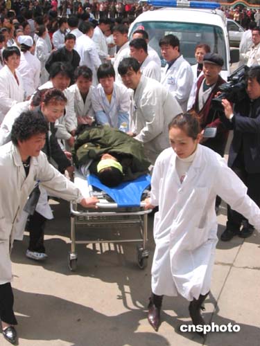 四月二十四日,吉林省吉林市蛟河奶子山騰達(dá)煤礦發(fā)生透水事故,六十九名礦工被困井下。經(jīng)連夜搶救,至二十五日十四時,已有三十九人獲救。圖為醫(yī)務(wù)人員正將獲救礦工緊急送往醫(yī)院進行救治。作者:呂陽