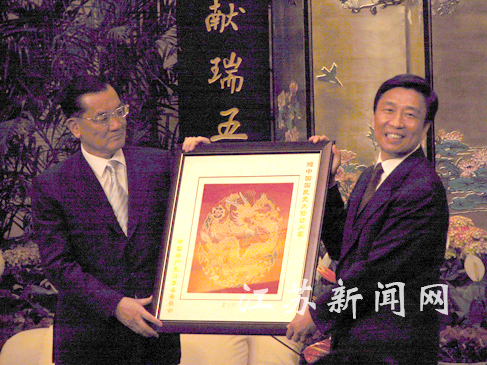 李源潮向連戰(zhàn)贈送了禮品,是一副南京特產(chǎn)云錦織出的金絲團龍。李源潮說:龍是中華民族的象征。連戰(zhàn)向江蘇省回贈了禮品,是臺灣的三羊開泰瓷瓶,連戰(zhàn)說:以此祝愿江蘇發(fā)展、興旺。