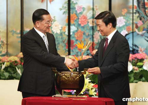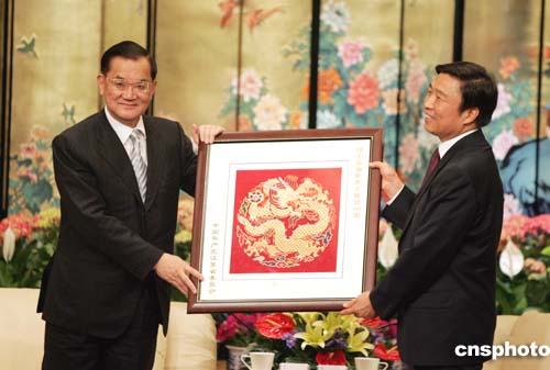 會(huì)見時(shí),中共江蘇省委向訪問團(tuán)贈(zèng)送了過去專為皇家制造、現(xiàn)成為南京藝術(shù)象征的絲織工藝品“金絲團(tuán)龍”,李源潮說,龍是中華民族的象征。連戰(zhàn)主席也回贈(zèng)了一件臺(tái)灣名家制作的工藝品三羊開泰瓷瓶。連戰(zhàn)說,以此祝愿江蘇發(fā)展、興旺。