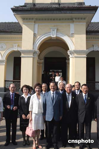 參觀結(jié)束后,連戰(zhàn)與國(guó)民黨主要領(lǐng)導(dǎo)人在孫中山外賓接待處的國(guó)民黨黨旗下合影留念。連戰(zhàn)還為中國(guó)近代史遺址博物館題詞:“和平奮斗救中國(guó)”。