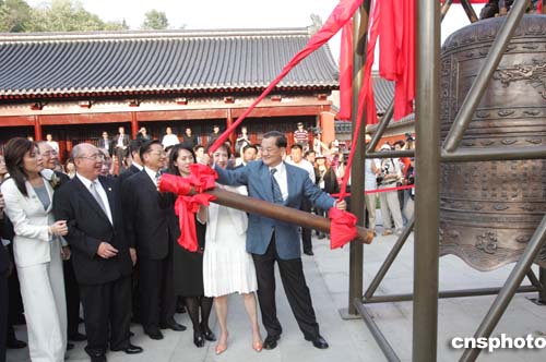 今天,天妃宮里香火縈繞。連戰(zhàn)一行在此參觀了新落成的媽祖神像。連戰(zhàn)和夫人及國(guó)民黨三位副主席,相繼撞響了平安鐘,寓意四海平安、吉祥如意。