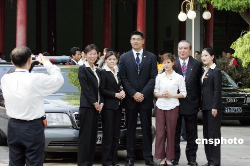 連戰(zhàn)的長子連勝文(右四)四月二十七日在南京參觀中國近代史遺址博物館時,與臺灣著名藝人、亞洲影帝柯俊雄(右二)以及當?shù)氐膶в涡〗銈円黄鸷嫌。作者:毛建?/div>