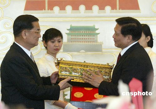 會見結(jié)束后,賓主互贈禮物表深意。劉淇向連戰(zhàn)贈送了微縮的金絲鑲嵌景泰藍(lán)九龍壁,連戰(zhàn)向劉淇回贈祖父連橫的著作《臺灣通史》,自己的近作《改變,才有希望》,以及一個名為“希望振飛”的琉璃工藝品。