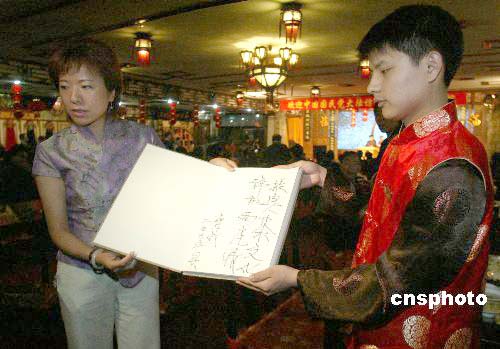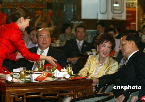 為了迎接這位“鄰家大哥”,老舍茶館的服務員分別穿上了只有在重大節(jié)日才穿的大褂和旗袍。茶館總經(jīng)理尹智君說,茶館是以辦喜事的心情來迎接連戰(zhàn)大哥及其率領的訪問團,我們希望他到這里就象到了家似的。環(huán)顧茶館三樓演出大廳,木質的廊窗,精雕細制中不失大家氣度,高掛的各式大紅的宮燈,褐色的硬木八仙桌。金色椅墊的背靠椅,黃白花紋的細磁蓋碗都透著濃郁的京味。