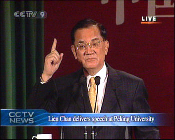 連戰(zhàn)說,我這一次到大陸來訪問,我說“來的不易”,因?yàn)橛腥舾傻娜撕苓t疑,甚至于有一種批判,認(rèn)為我到這里來,是為了進(jìn)行所謂“第三次的國共和談”,所以我的目的是要“聯(lián)共制臺(tái)”,那個(gè)“臺(tái)”下面還是有個(gè)“獨(dú)”字。