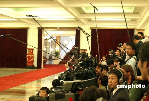 四月二十九日下午,中共中央總書記胡錦濤在北京會(huì)見中國(guó)國(guó)民黨主席連戰(zhàn)。大批海內(nèi)外媒體記者云集人民大會(huì)堂見證這一歷史時(shí)刻。作者:廖文靜