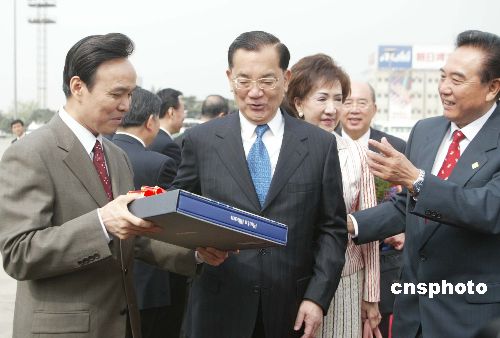 四月三十日,中國國民黨主席連戰(zhàn)結(jié)束北京之行啟程前往西安,中共中央臺辦主任陳云林、北京市委副書記龍新民在機場為其送行。圖為連戰(zhàn)獲贈北京之行紀念像冊分外驚喜。作者:廖文靜