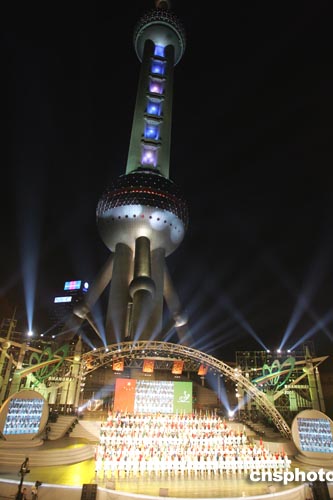 開幕式會場借助東方明珠塔十一個圓球與乒乓球十一分計分制的天然巧合,體現(xiàn)了“大珠小珠落玉盤”的美好意境。儀式結束后,一千一百八十名演員參與的《乒壇暢想》慶典文藝演出,用歌舞、武術、雜技、乒乓球表演的形式,充分展示了中國特色、上海特色和乒乓特征。