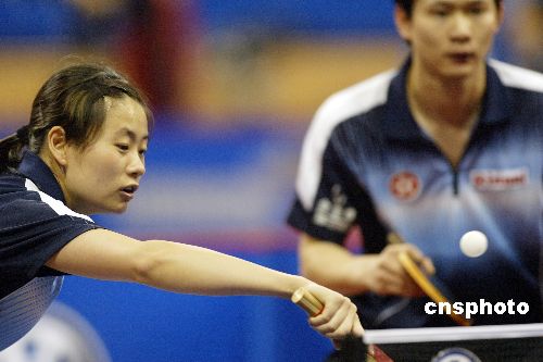 五月二日,在上海體育館舉行的第四十八屆世界乒乓球錦標(biāo)賽進(jìn)入了第三天,混雙首場(chǎng)大戰(zhàn)全面打響,中國(guó)香港選手梁柱恩、桑亞嬋在比賽中戰(zhàn)勝韓國(guó)選手晉級(jí)第二輪比賽。圖為梁柱恩、桑亞嬋在比賽中。作者:盛佳鵬