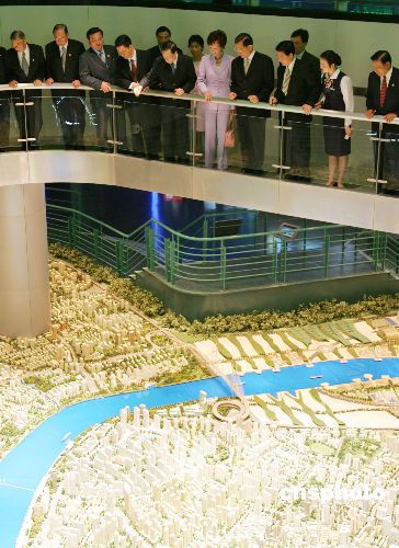 二日下午,在完成拜會汪道涵先生、與長三角臺商餐敘及演講等重要使命后,連戰(zhàn)偕夫人與訪問團成員放松身心、興致盎然來到該市樞紐地段——人民廣場附近,觀摩城市規(guī)劃展示館與博物館。