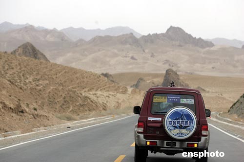 中新網(wǎng)5月3日電 二零零五年五月三日,穿越可可西里聯(lián)想鋒行探險(xiǎn)隊(duì)車隊(duì)抵達(dá)北京——拉薩的109國道2500公里處。