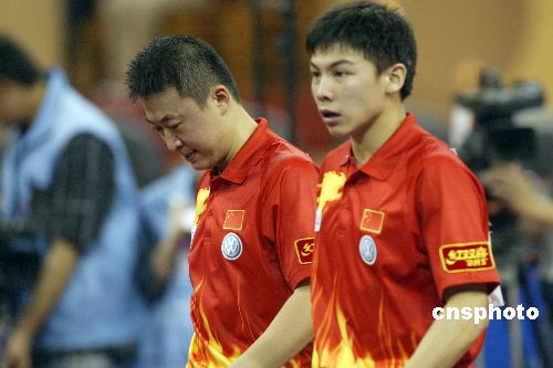 五月四日,在上海體育館進行的第四十八屆世界乒乓球錦標(biāo)賽男雙半決賽中,雅典奧運會冠軍馬琳、陳玘以一比四不敵德國新搭檔蘇斯、波爾,無緣決賽。這也使中國選手提前獲得男雙冠軍的希望落空。圖為馬琳(左)、陳玘黯然離開賽場。 作者:盛佳鵬