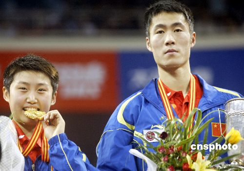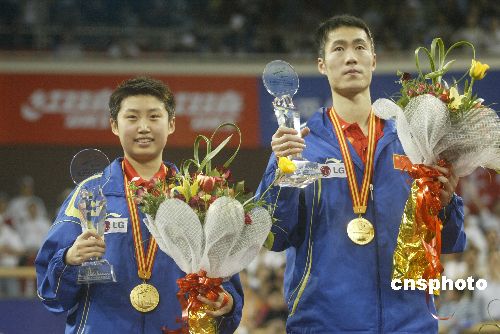 第四十八屆世界乒乓球錦標(biāo)賽混合雙打的比賽五月四日晚在上海體育館進(jìn)行,中國選手包攬了前三名,王勵(lì)勤、郭躍奪得冠軍。作者:盛佳鵬