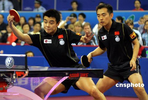 圖:孔令輝/王皓戰(zhàn)勝波爾/蘇斯獲得世乒賽男雙冠軍