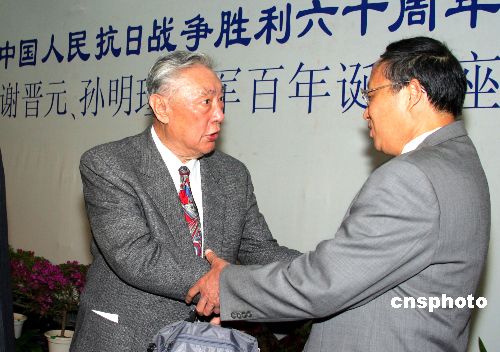 中新社上海五月十日電 (記者許曉青)適逢世界反法西斯戰(zhàn)爭勝利六十周年,曾參與中國抗日戰(zhàn)爭的諸位名將后裔和經歷過抗戰(zhàn)的數十位黃埔老兵今天會聚上海黃埔軍校同學會,紀念“八·一三”抗戰(zhàn)時期誓死保衛(wèi)四行倉庫的謝晉元將軍誕辰一百周年。