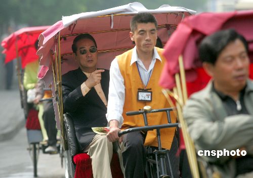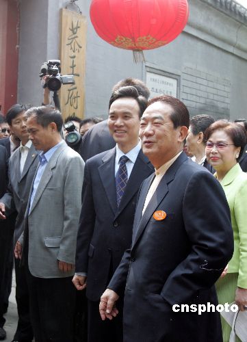 今日上午九時(shí)四十分許,四十余輛紅頂紅塌的人力三輪車(chē)隊(duì)搭載宋楚瑜一行,穿游什剎海的悠長(zhǎng)胡同,行抵恭王府。豪宅門(mén)側(cè)為愛(ài)新覺(jué)羅.溥杰所題:恭王府花園。宋楚瑜笑稱(chēng)自己愛(ài)看《大宅門(mén)》等歷史劇,對(duì)老北京文化也素有好感,因此慕名而至。
