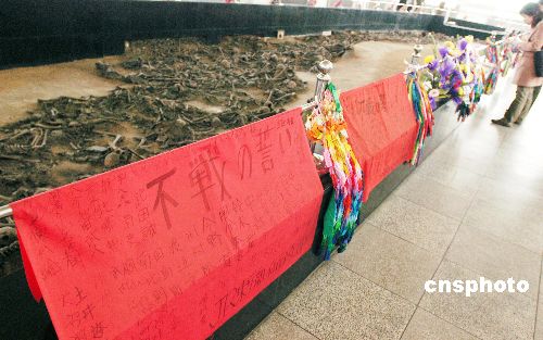在遼寧撫順“平頂山慘案紀念館”內(nèi),許許多多來自日本的和平與正義人士在遇難者遺骸的四周懸掛紙鶴,表示哀悼。據(jù)介紹,三十多年來,已有數(shù)十萬日本人到撫順參觀“平頂山慘案”遺址紀念館,每一位目睹“慘案遺址”的參觀者,面對累累白骨,無不為當(dāng)年日軍的殘暴所震驚。作者:王麗南