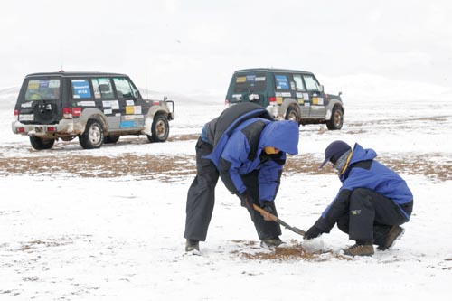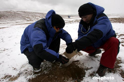 探險(xiǎn)隊(duì)為環(huán)境保護(hù)科考項(xiàng)目采集土壤標(biāo)本(圖)