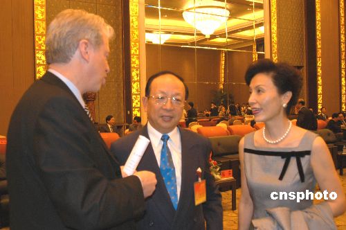 五月十七日晚,前來(lái)參加第七屆海峽兩岸經(jīng)貿(mào)交易會(huì)的臺(tái)灣知名人士蔣孝嚴(yán)與夫人黃美倫在福州香格里拉大酒店與海外工商界人士親切交談。作者:福建分社