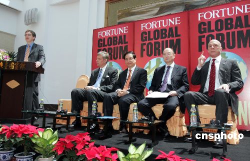 2005北京《財富》全球論壇5月18日專門舉行“中國銀行業(yè)改革近況”會議,中國銀監(jiān)會主席劉明康(左三)、國家開發(fā)銀行行長陳元(右二)用嫻熟的英語坦誠地與麥肯錫公司亞洲區(qū)董事長鮑達民(左二)、安永會計師事務(wù)所合伙人羅德曼(右一)等人對話。作者:任晨鳴
