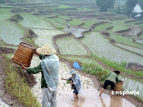5月20日,重慶市云陽縣紅獅鎮(zhèn)中心壩田園,當(dāng)?shù)厝罕娬诿坝瓴逖。眼下,正值三峽庫區(qū)農(nóng)村“雙搶”(大春搶種搶收)季節(jié),一年一度的水稻栽插處在節(jié)骨眼上。但2005年的三峽梅雨季節(jié)比常年來得早,半月前便呈現(xiàn)三天兩頭雨的“孩兒臉”氣候。為了不誤農(nóng)時,峽江兩岸農(nóng)村處處可見村民斗雨整田插秧的大忙景象。據(jù)了解,早到的多雨天氣對中高山及時出苗十分有利,但雨水也對秧苗固窩、勞作出行造成影響。雖然天公喜怒無常、冷熱頻換,人們對搶抓糧食生產(chǎn)的熱情不減。作者:饒國君