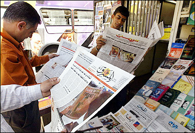 5月21日的《阿拉伯每日新聞》在頭版刊登了一副薩達(dá)姆的獄中照片,圖片上薩達(dá)姆在洗衣服。圖為伊拉克人在報(bào)亭閱讀該報(bào)。 春風(fēng)