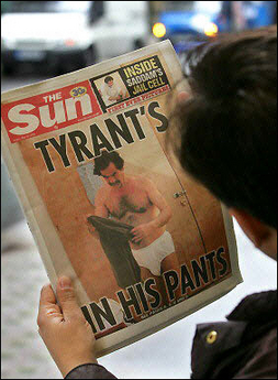 一男子在倫敦街頭閱讀太陽報,該報當(dāng)天頭版刊登了薩達姆獄中照片。美軍正在追查這些照片是何人拍攝的。(春風(fēng))