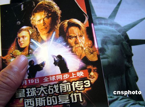 2005年5月23日,一位上海影迷拿著《星球大戰(zhàn)前傳3》的電影票。這是個注定屬于盧卡斯和其星戰(zhàn)帝國的日子。美國當(dāng)?shù)貢r間5月19日,《星球大戰(zhàn)前傳3》上映首日票房破5000萬美元,世界電影史上的單日票房紀(jì)錄就這樣被刷新,同時令去年6月《蜘蛛俠2》創(chuàng)造的4040萬美元的單片首日票房紀(jì)錄作古。《星戰(zhàn)前傳3》以數(shù)字向世人詮釋了一部好萊塢真正巨片的商業(yè)價值。作者:紹常