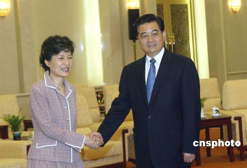 中新網(wǎng)5月24日電 中共中央總書記、國家主席胡錦濤24日下午在人民大會堂會見了韓國大國家黨代表(黨首)樸槿惠,賓主進行了友好談話。