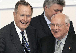 老布什還談到了戈?duì)柊蛦谭蛉ツ暧^看他為慶祝80歲生日而進(jìn)行跳傘時(shí)的情況。他說:“我一落地就看到他在那里等我。他一手拿著一束鮮花,一手拿著伏加特酒。生命在那天是多么的美好!