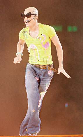 中新網(wǎng)6月1日電 據(jù)香港媒體報(bào)道,郭富城(城城)的神秘演唱會(huì)舞臺(tái)造型,在昨晚的“郭富城舞臺(tái)寶典@飛越舞林演唱會(huì)2005二部曲”揭曉,原來城城鏟了一個(gè)光頭,而且頭部畫了一只小鳥。城城這個(gè)突破性造型,令全場(chǎng)觀眾尖叫達(dá)數(shù)分鐘之多,極為震撼。