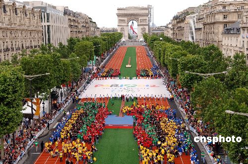 6月5日,法國巴黎香榭麗舍大道被裝扮成巨型競(jìng)技場(chǎng),數(shù)萬巴黎人聚集于此,期盼巴黎申辦2012年夏季奧運(yùn)會(huì)能夠成功。作者:Ic/cnsphoto