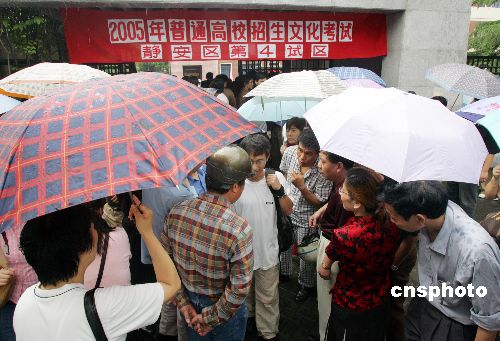 六月七日,二○○五全國高考在各地同時拉開帷幕,今年全國考生人數(shù)為八百六十七萬,上海有十一萬考生今起走進考場,一些家長等在考場外冒雨“陪考”。作者:湯彥俊