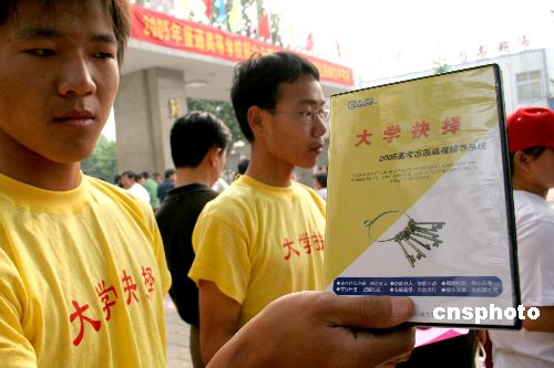 6月7日是全國高考開考的第一天,鄭州多個(gè)考點(diǎn)聚集著身穿“志愿填報(bào)專家”的工作人員向廣大考生和家長宣傳推銷“2005高考志愿填報(bào)”的相關(guān)資料。作者:陳代述