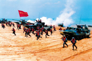 午后,一天中最熱的時候,趁著海水漲潮,官兵開始了游泳訓(xùn)練。記者看到,在正面寬約5公里的海灘上,全旅官兵長龍似的排開,露出一片黝黑的鋼鐵般的脊背。隨著一顆信號彈升空,數(shù)千名官兵同時下海,場面很是壯觀。官兵們奮力劃水,漸游漸遠(yuǎn),變成波峰浪谷中若隱若現(xiàn)的一個個黑點(diǎn)。該旅的游泳訓(xùn)練,上至旅長、政委,下至駕駛員、炊事兵,全旅官兵都要下海。記者在海邊看到,被譽(yù)為“兩棲作戰(zhàn)先鋒”的裝甲團(tuán)團(tuán)長陳昌鋒帶頭下海,身上被水母蜇出大片大片的紅疹。
