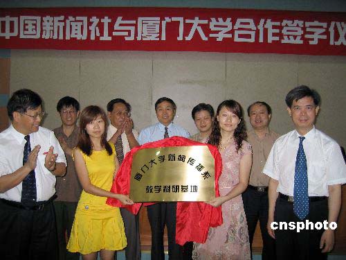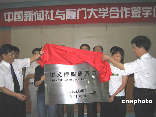 中新社郭招金總編輯一行專程從北京蒞廈,與廈大副校長潘世墨一起出席今日的簽字儀式,并為“廈門大學(xué)教學(xué)與研究基地”和“華文傳媒研究中心”揭牌。廈大出席簽約儀式的還有廈大黨委宣傳部鄭保東部長、人文學(xué)院院長陳支平教授、副院長陳培愛教授、新聞傳播系副主任黃星民等。