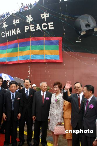 臺灣船東直接在祖國大陸訂造的第一艘船“中華和平”號十日在滬舉行盛大的命名交船儀式,圖為全國政協(xié)副主席董建華、中國國民黨主席連戰(zhàn)夫人連方瑀女士等專程趕來見證海峽兩岸這一重要的歷史性時刻,并在“中華和平”號前合影留念。作者:孫自法