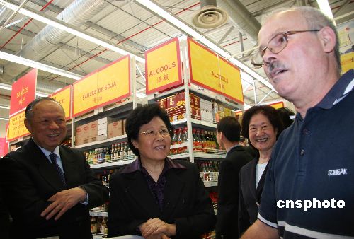 中國(guó)國(guó)務(wù)院僑辦主任陳玉杰(左二)一行當(dāng)?shù)貢r(shí)間六月十一日來(lái)到法國(guó)華人最大的企業(yè)之一陳氏兄弟公司總部參觀,同陳氏集團(tuán)董事長(zhǎng)陳克威(左一)進(jìn)行了會(huì)談。圖為陳玉杰與購(gòu)物的法國(guó)顧客交談。作者:鐘誠(chéng)